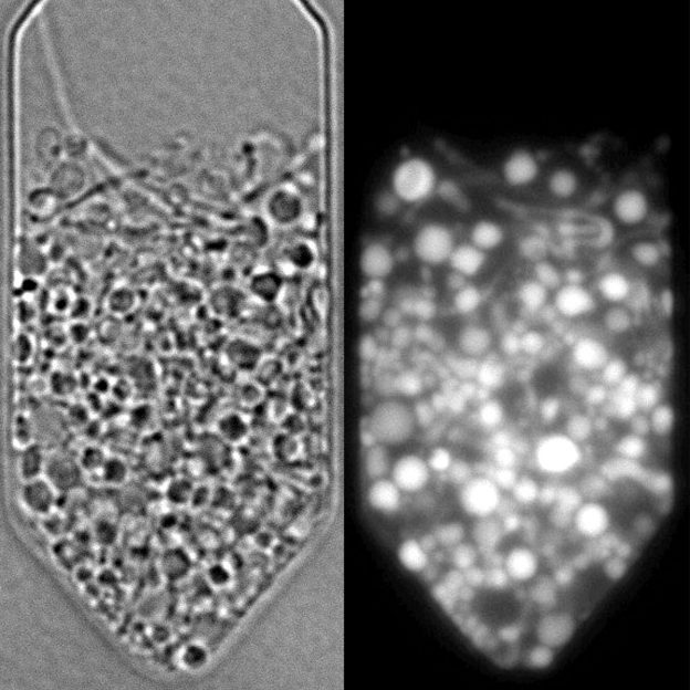 Fél évtizeddel később aztán bejelentették, hogy elkészült a JCVI-Syn3.0, ami már valóban fontos lépés volt a genom-minimalizálás felé, hiszen az M. mycoides genom eredeti 901 génjéből több százat kiszórtak és végül 473 maradt. A Sny3.0 kétségtelenül élt, de ahogy akkor is tudni lehetett, azért egy picit “magyar narancs” jellegű volt, osztódási nem mindig voltak szimmetrikusak, gyakran nagy vakuólák, máskor filamentózus szerkezetek jelentek meg a tenyészetekben.