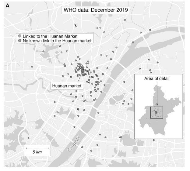 Amit a mostani Science cikk hozzáad a történethez, hogy a 2019 decemberi kvázi első 174 esetből 155-ben képesek voltak meghatározni a betegek pontos lakóhelyét, hogy létrehozhassák a térképet. Az esetek eloszlása jól mutatja, hogy mind a piaccal közvetlen kontaktusban állók, mind azok akik nem jártak a piacra, valahol a piac környékén éltek, és minél közelebb lakott a piachoz valaki, annál nagyobb (volt) az esélye, hogy megfertőződjön, hiszen nagyobb eséllyel találkozhatott valakivel, aki már része volta korai terjedési láncoknak (a többes szám itt nem véletlen, lásd alább).
